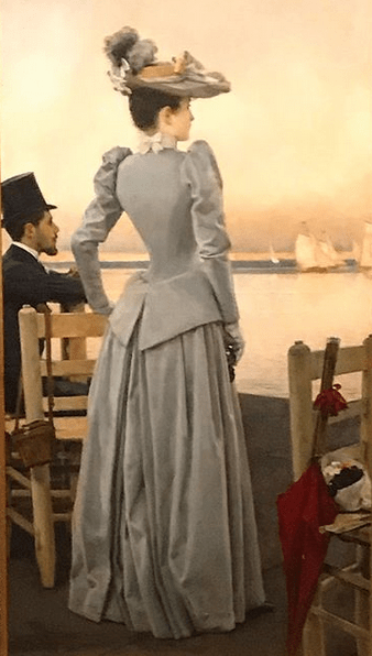 En la visita al museo, resulta imposible no parar junto a esta impresionante obra, tanto por su calidad como por su gran tamaño. El autor la presentaba junto con otras cinco en la primera exposición general de Bellas Artes de Barcelona. pero solo para ser expuesta y fuera de venta. Se trata de una monumental figura de ejecución rápida y colores mas vivos que otras obras del autor. La escena esta llena de naturalidad. La resolución del mar ejecutado de forma sintética y moderna y la precisión del dibujo queda patente en los pliegues del vestido de la dama.