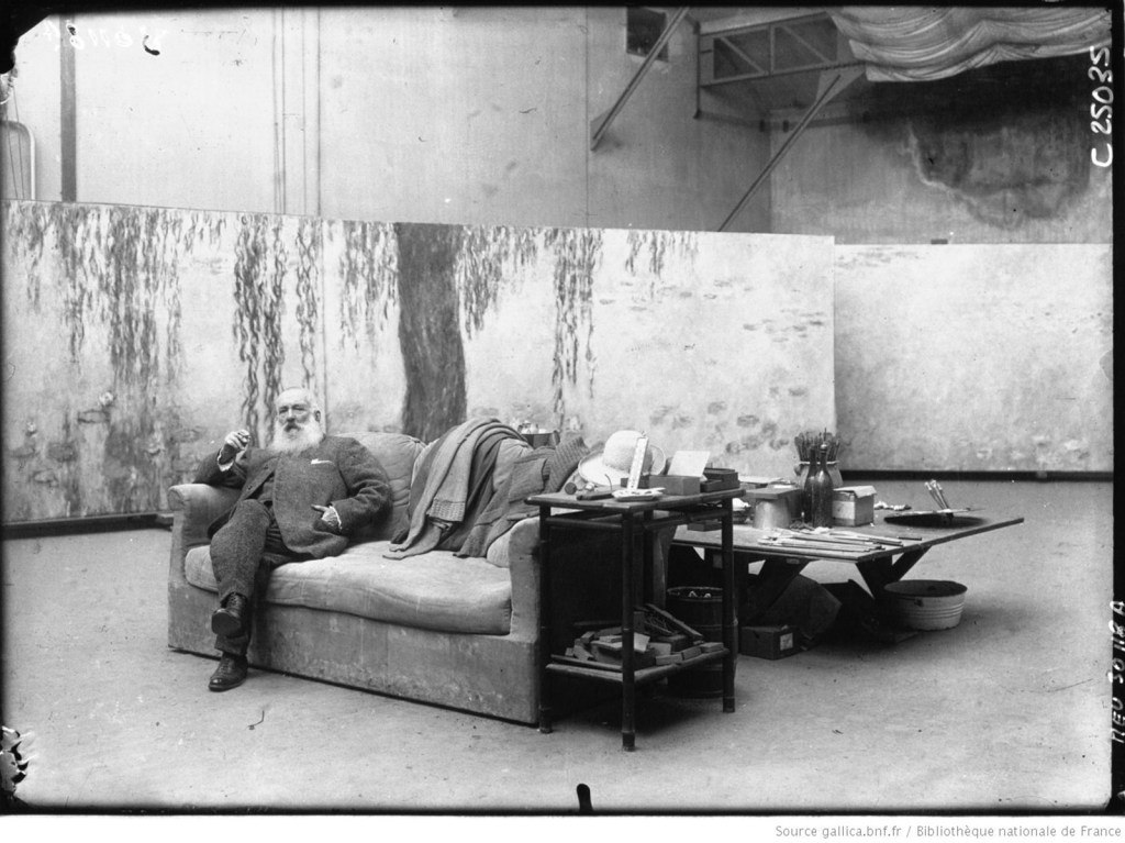 En 1914, a la muerte de su hijo, Monet cayó en un estado de tristeza, encontrando una salida en el deseo de retomar un proyecto a gran escala: «nenúfares “ a lo largo de paredes”, sus «paisaje acuáticos» como él escribiría. Llevó a cabo este proyecto, a pesar de sus dudas y obstáculos, gracias al apoyo de su gran amigo y político, George Clemenceu, quién además tenía gran interés en el arte. Logra convencer a Monet para instalar en L’Orangerie la colosal obra. que estaba elaborando. lo visitaba con frecuencia durante la Gran Guerra animándole a completarla: «se lo debes a Francia, a todos esos jóvenes que nunca volverán de las trincheras». Monet se dedica junto a la arquitecta Camille Lefèvre al proyecto, dispuesto en dos salas ovaladas formando el signo del infinito. Debido al gran tamaño de sus obras y a pesar de la guerra, Monet alternaba pintar dentro de su estudio, que tenía tejado con cristaleras y la pintura al aire libre