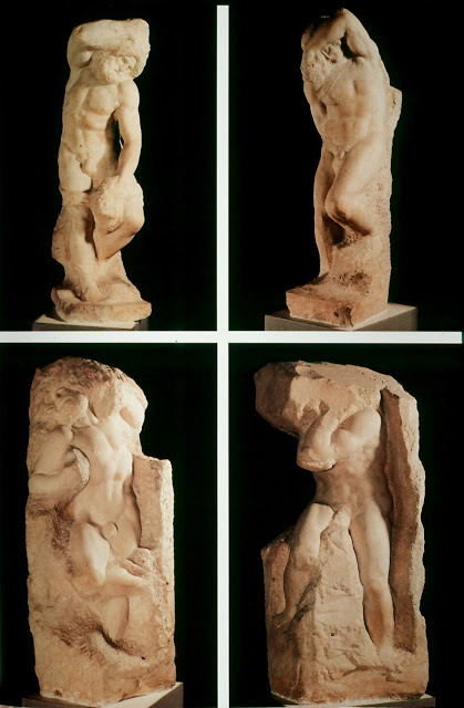 Las figuras parecen estar eternamente luchando por librarse de la esclavitud de la piedra a la que pertenecen. Miguel Ángel decía que cada bloque de mármol tenía un alma que él iba liberando en su proceso creativo. Son cuatro figuras masculinas : El «Esclavo joven”, el “Esclavo que se despierta”, el “Esclavo con barba” y “Atlas” pueden fecharse a un período entre 1519 y 1534 . Cada uno es un ejemplo de la práctica de Michelangelo llamada “no-acabado”, en la que se puede percibir el largo y difícil proceso de ejecución de la escultura a través los signos del cincel en la superficie. Hay una sensación de tensión, de movimiento dado por la torsión acentuada: una especie de lucha interna de la figura que trata de escapar del mármol y del espíritu que pretende liberarse de la carne para acercarse a Dios. Cada bloque muestra músculos sólidos en los brazos y las piernas, señal de la profunda pasión que Michelangelo tenía para la anatomía humana.