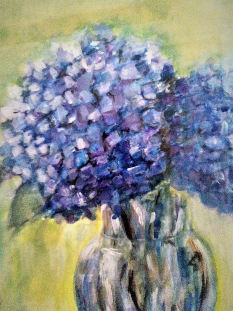 Y para que no esté sola, unas hortensias azules de acuarela.