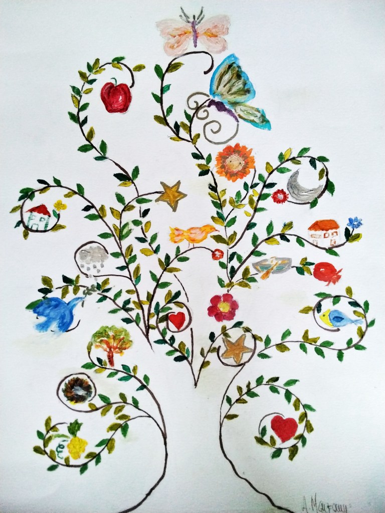 El árbol de la vida es la mejor ilustración de lo que significa el ciclo de la vida. Este es mi árbol, del que puede haber tantas versiones como personas…Las raíces del árbol representan el nacimiento, el tronco hace referencia al desarrollo personal y las ramas que se bifurcan en todas las direcciones simbolizan las diferentes decisiones que se toman en la vida, cada una de las cuales lleva por un camino determinado.