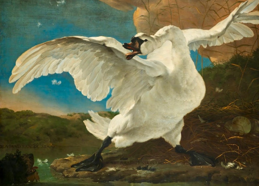 Jan Asselijn fue un pintor del barroco que se destacó por sus pinturas de animales, paisajes y escenas históricas. En esta, su obra maestra, pinta a un cisne con las alas abiertas, el cuerpo en tensión, defendiendo el nido con sus pichones del ataque de un perro.