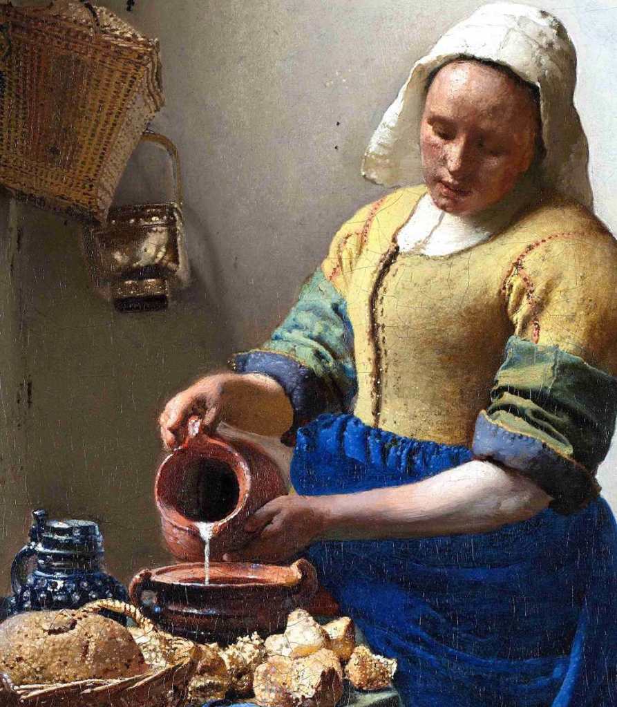 En esta, una de las obras más representativas del pintor barroco, se aprecia la simplicidad de lo cotidiano y se combina con la postura de la mujer que recuerda a una elegante estatua clásica, quieta en medio de la obra. Vermeer consigue transformar una actividad cotidiana en una obra de arte espectacular a través de su dominio de la luz, las sutiles texturas de su paleta y su capacidad de congelar la acción en una instantánea.